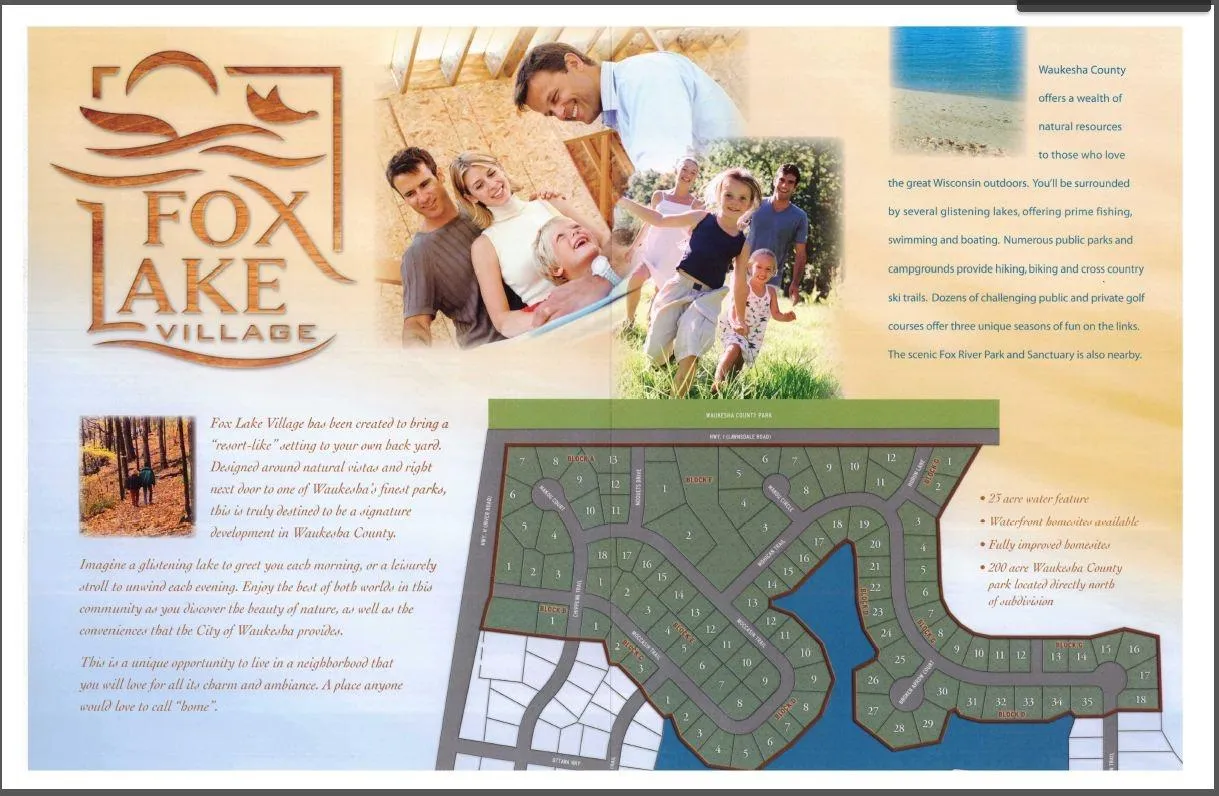 Build your dream home in Addition #3 of Fox Lake Village in the City of Waukesha. This lot features a fully exposed lower level on the water feature. Choose your own builder to live adjacent to the 200 acre Fox River Park and just a few miles to Downtown Waukesha, Waukesha West, Waukesha Memorial Hospital plus popular retailers and restaurants. The development features a 23 acre water feature and is the former site of a MBA Parade of Homes. All lots are fully improved with municipal sewer and water.