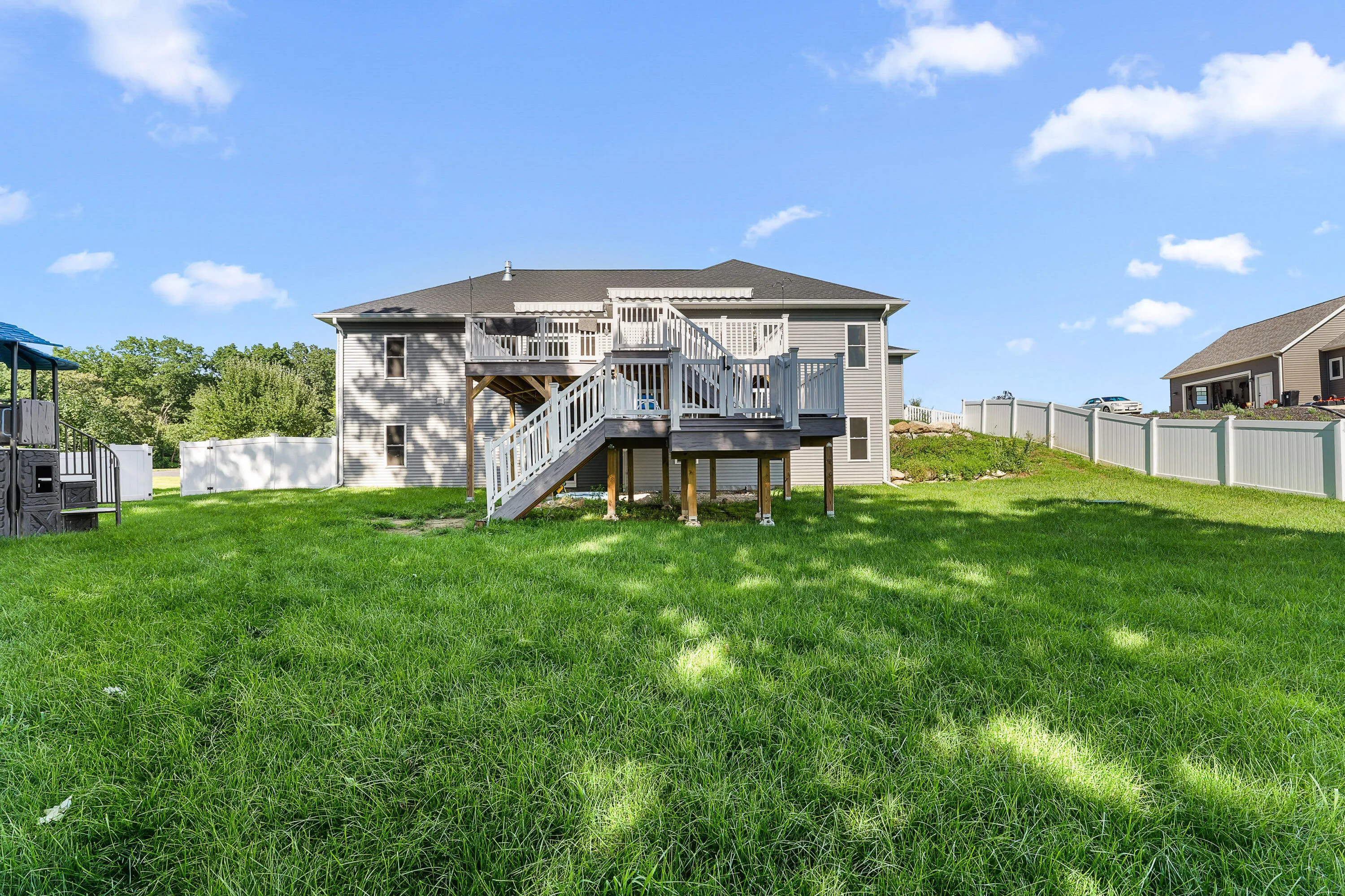 Welcome Home to a newer build that includes all the extras! This open concept, easy flow living space offers vaulted ceilings, gas fireplace, windows galore for natural light! The kitchen has all newer appliances included, quartz countertops, new pull out drawers, & Walk In Pantry! Three bedrooms are offered with a MBR suite that includes a custom built master closet you will love! Two full bathrooms on the main floor, and a private office/den. Large main floor laundry including top of the line washer & dryer. The basement has plenty of room to expand, already has multiple windows, & walkout patio doors installed. Enjoy entertaining or relaxing on the 2 tier composite deck with remote retractable awning. Let the kids & dogs roam in the newly fenced in backyard. Make this yours today!