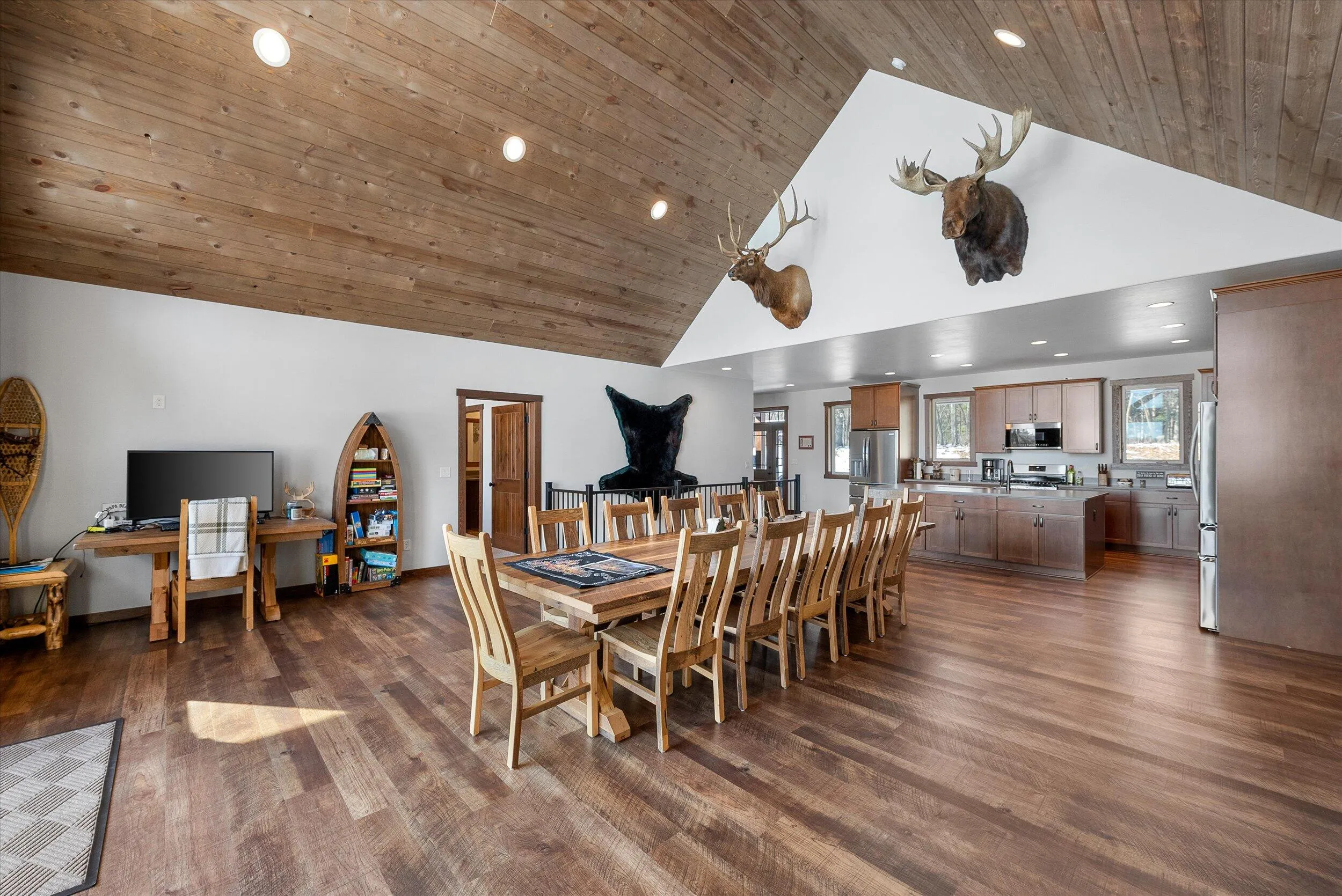 This 2022 custom ranch on Long Lake maximizes capacity with a 6-bedroom, 4-bath layout. Main floor features 3 beds, 2 baths, and a vaulted living/dining area with an expansive kitchen. An elevated deck extends from this level, overlooking the lake frontage. Walkout lower level adds 3 beds, 2 baths, and a family room anchored by a gas fireplace, opening to a patio. The 3+ car attached garage is a sportsman’s asset: insulated, heated, and boat-deep. Site features include a boat house, backup generator, and irrigation system. Wooded 3.4 acre lot offers privacy and seclusion.