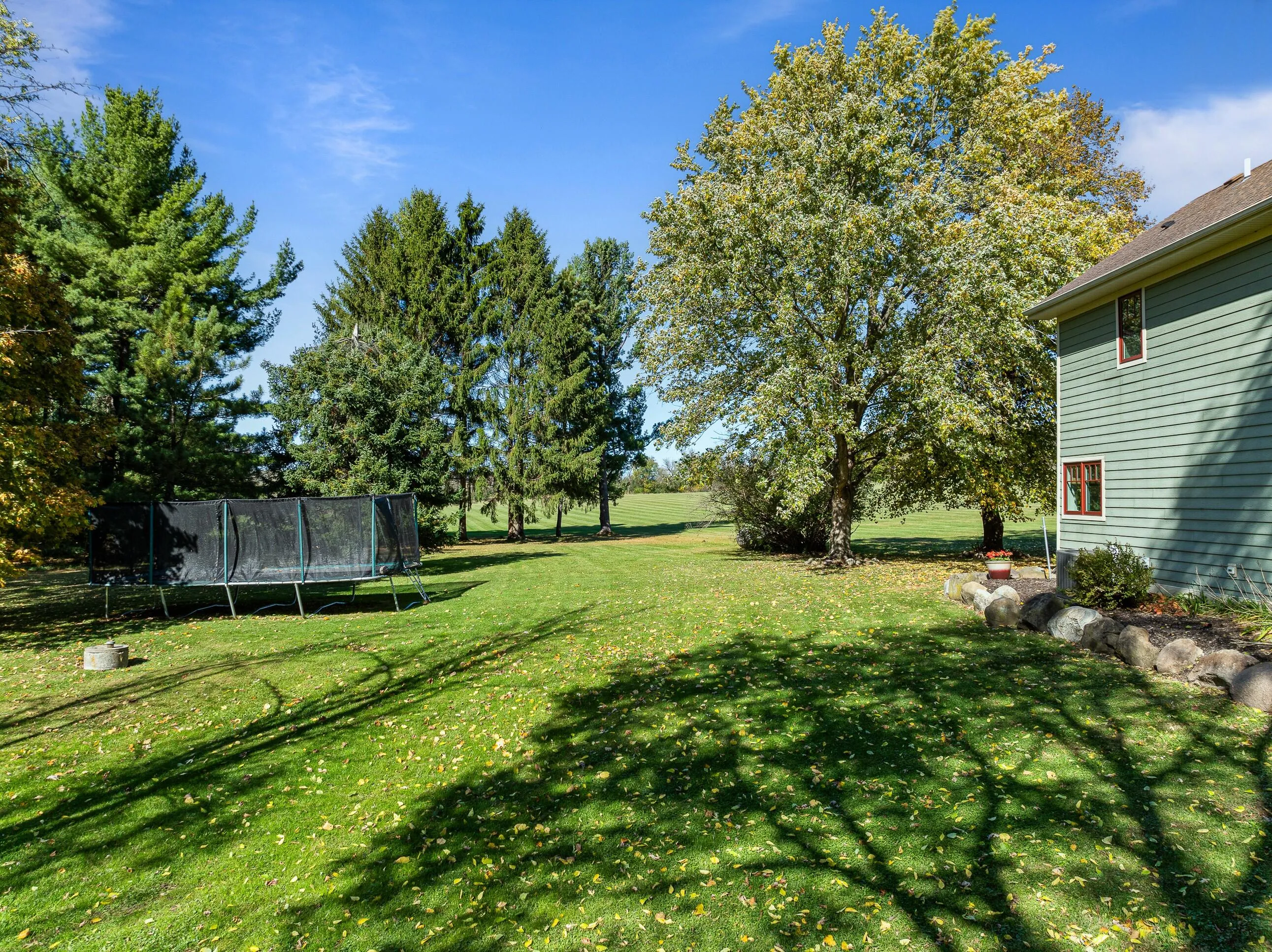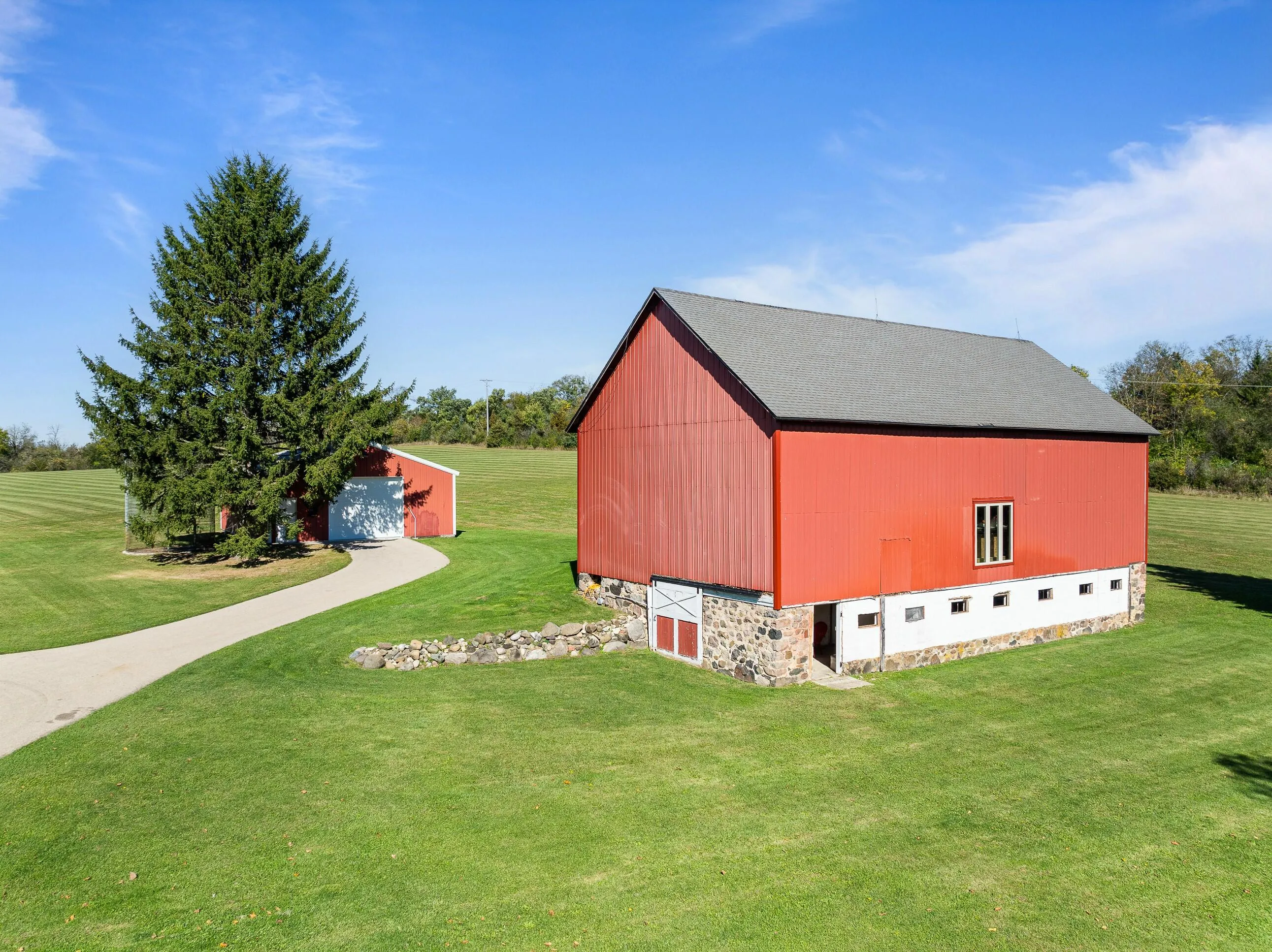 Lake Geneva 35 acre private retreat with gated entrance. Trees border the property, shade on the home deck is perfect for taking in the view of the luscious sunny fields of green. This retreat is ready for fun! 2nd parcel offers a motocross, dirt biking course; enjoy basketball in the exceptional, large barn with ample storage for toys. The small barn is set up as a workout area! The home is outstanding! Light flows through updated rooms, filled with shiplap, beadboard & a touch of barn wood. Offers nice entertainment spaces, FP in living room, kitchen with SS Appliances, quartz tops, counter seating & dining open to patio. Main level primary bedroom suite feels like a vacation at home, featuring beautifully tiled bath with rain shower. Imagine your own world on this exceptional property!