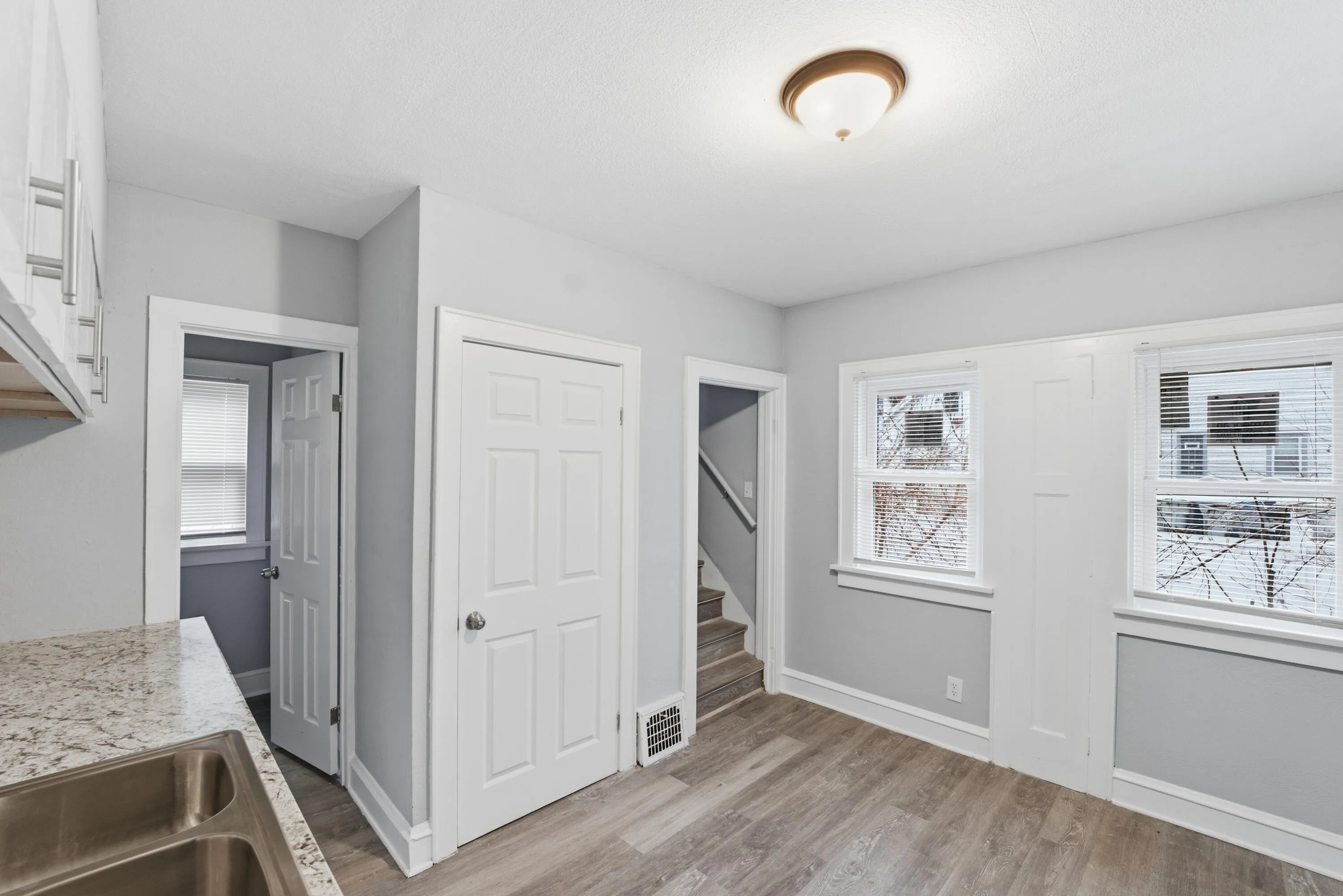 Refreshed 4 bedroom 1 full bath bungalow offering space, character, and new updates throughout. The inviting living room features a charming brick artificial fireplace, and stained glass accents, while the formal dining room showcases classic leaded stained glass built ins. The updated kitchen shines with new cabinets, counters, backsplash, and fixtures. A fully renovated bath includes a new vanity, toilet, and shower. Two bedrooms on the main level and two upstairs plus a bonus family room provide flexible living space. Fresh paint, new flooring, and new windows throughout. Two car detached garage and full basement complete the home. Schedule your private showing today and make it yours!