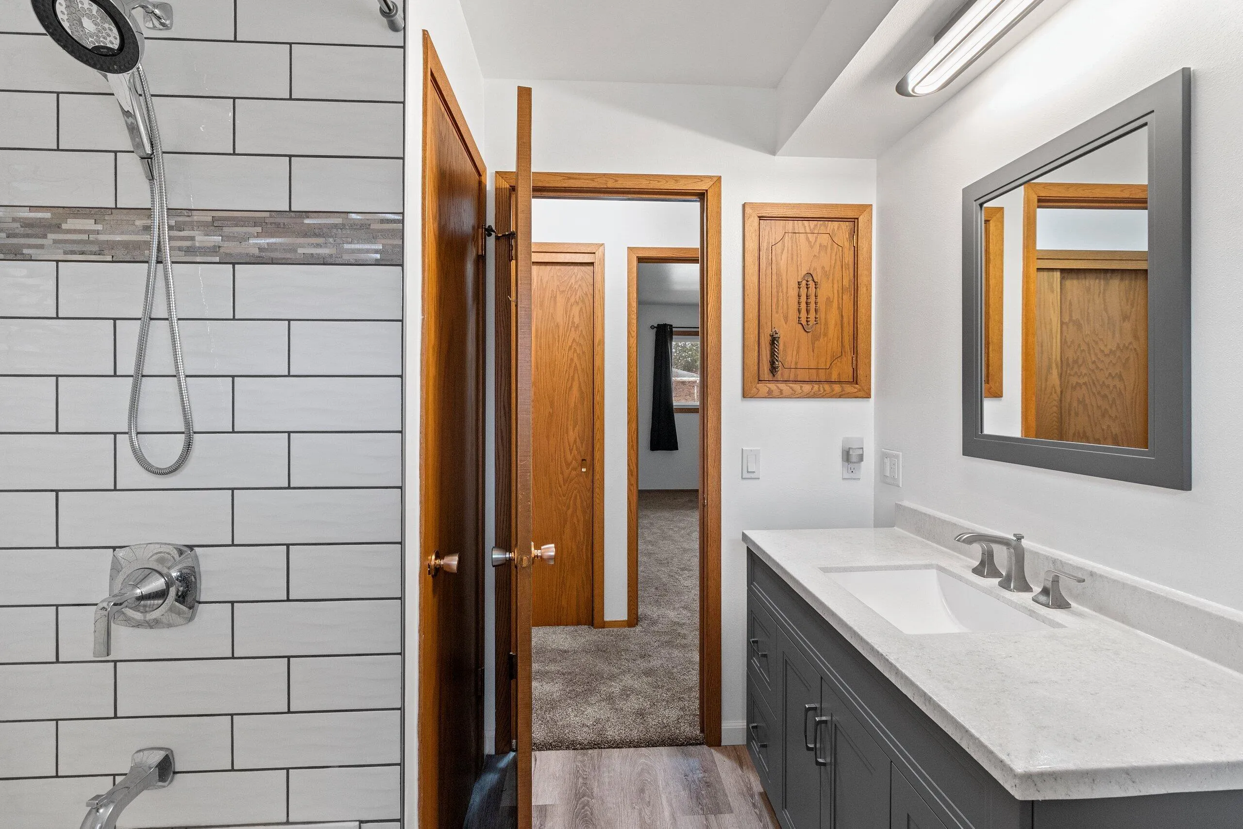 Beautifully updated all-brick ranch home located in a great southside neighborhood. This meticulously maintained home features a spacious living room with plush new carpet, a professionally remodeled kitchen complete with modern shaker-style cabinetry and new stainless steel appliances, an updated full bath w/ tiled shower, an additional 1/2 bath, and an over-sized primary bedroom complete with his & hers closets. There is plenty of storage in the lower level and a fun retro rec room with a dry bar & electric fireplace included! Keep the vintage vibes or update the space to fit your taste. Most of the windows throughout have been replaced. New roof, gutters, & gutter guards in 2018, New furnace & a/c in 2021, and water heater& sump pump 2024.