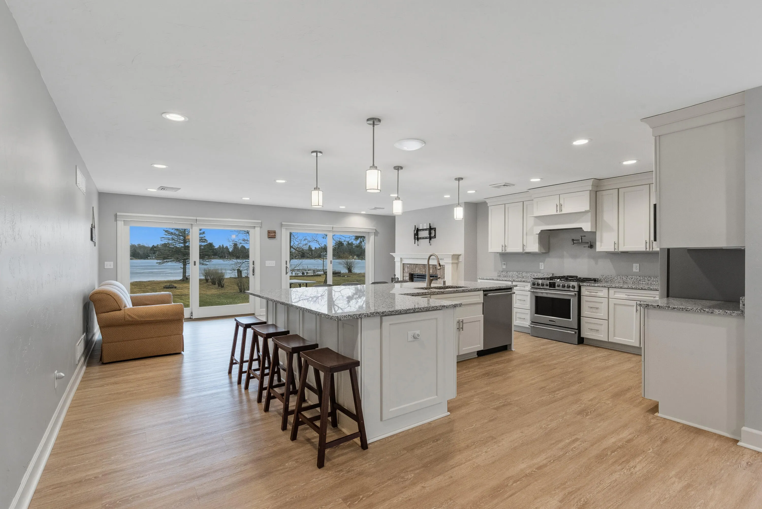 Welcome to effortless lake living on beautiful Pretty Lake. With 65′ of level, walk-out frontage and a clear, sandy-bottom lake, swimming and boating begin just steps from your door. Enjoy quiet mornings on the full-width lakeside patio, afternoons on the water from your premium pier, and evenings gathered around the firepit. Inside, wall-to-wall patio doors frame sweeping lake views. The chef’s kitchen overlooks the water and features a massive granite island designed for gathering, soft-close cabinetry with pull-outs, a gas range with pot filler, and stainless appliances. The primary suite offers lake views and private patio access. 2018 renovation. Roof 2023. Turnkey lake living.