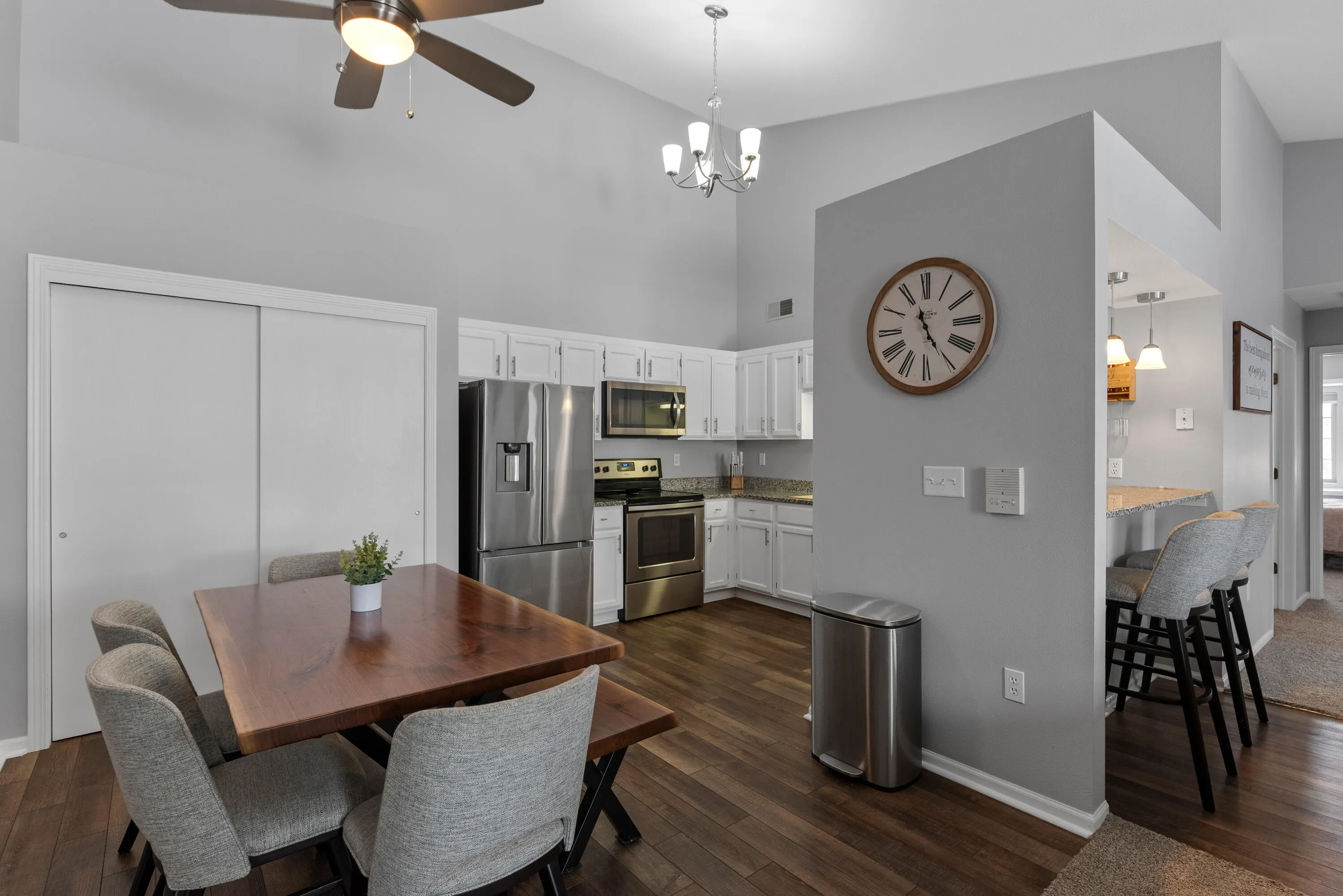 Welcome home to this tastefully updated 2 bedroom, 2 bathroom second story condo in the heart of Franklin. Enter through the private, attached garage and enjoy the bright and spacious great room with vaulted ceilings. The open-concept layout featuring an eat-in kitchen with newer granite countertops and breakfast bar is perfect for entertaining. Savor your morning coffee on the balcony that’s right off of the great room. The large primary bedroom with ensuite and walk-in closet along with a roomy second bedroom and full bath that houses your in-unit laundry round out this fantastic condo. Just minutes from shopping, resaurants and parks makes this the perfect central location. This move-in ready condo is ready for its next owner!