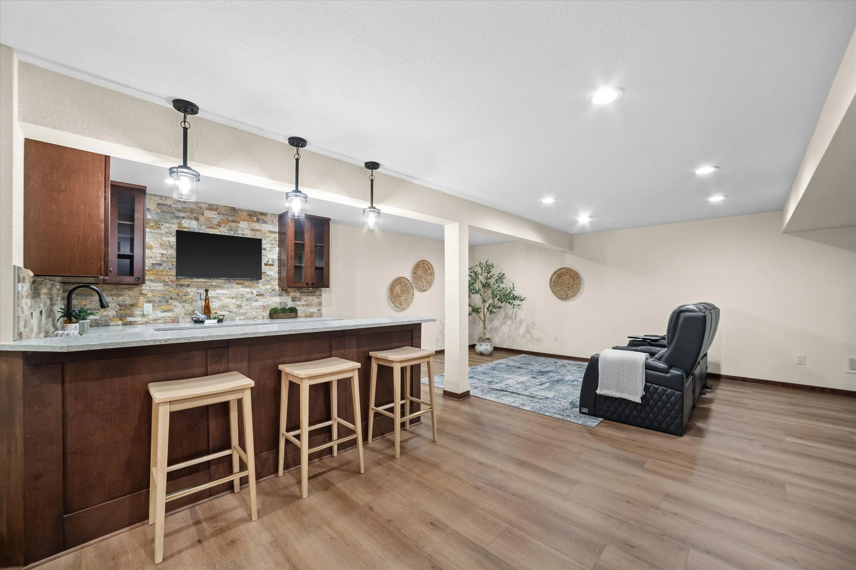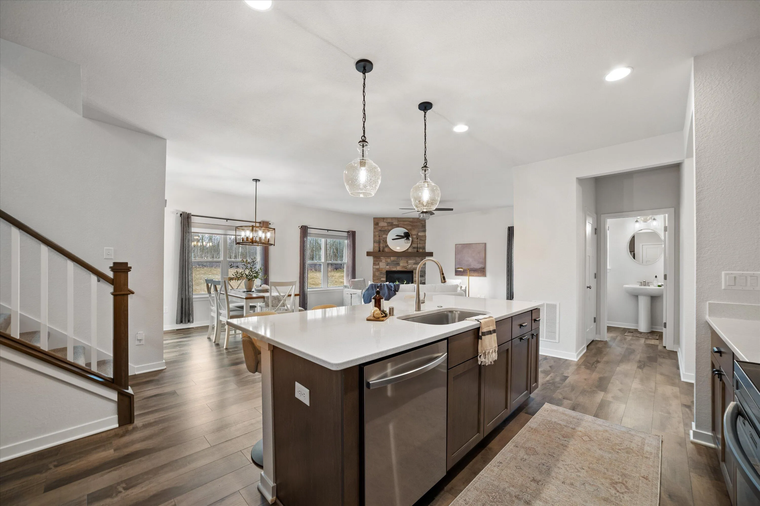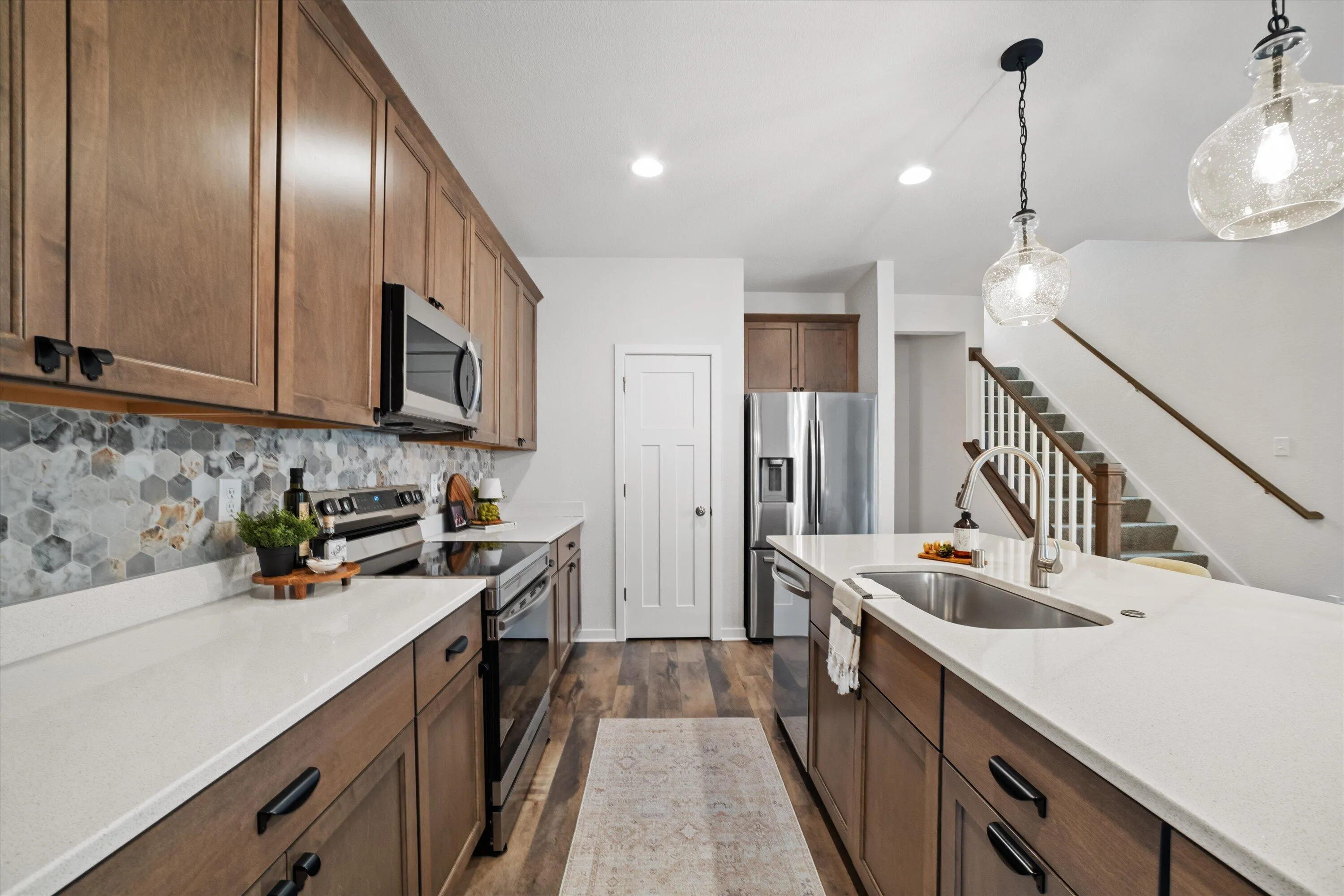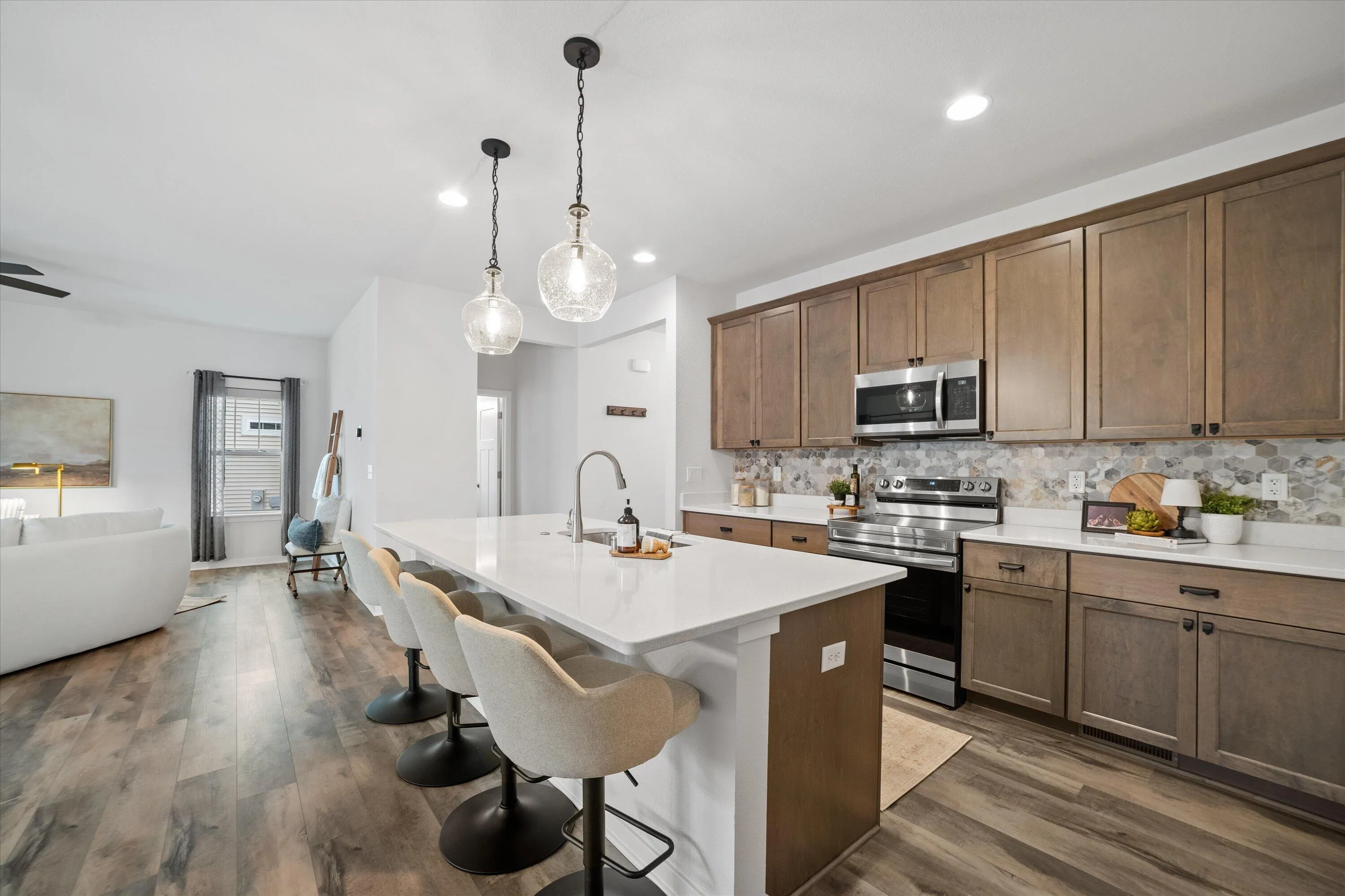 This nearly new 4-bedroom, 4-bath home in the desirable Paradise Trails community is move-in ready! Enjoy the beautifully landscaped oversized patio–perfect for relaxing or entertaining–with the preserve and trails as your backdrop. The Harrington model offers an open, spacious layout featuring luxury vinyl plank flooring throughout the first floor, stylish lighting, a tile backsplash in the kitchen, and tile flooring and shower in the primary bath. Functional design elements like the mudroom with a built-in bench add everyday convenience. The newly finished basement provides additional living space with a bar, entertainment area, and half bath, while the heated garage offers year-round comfort.