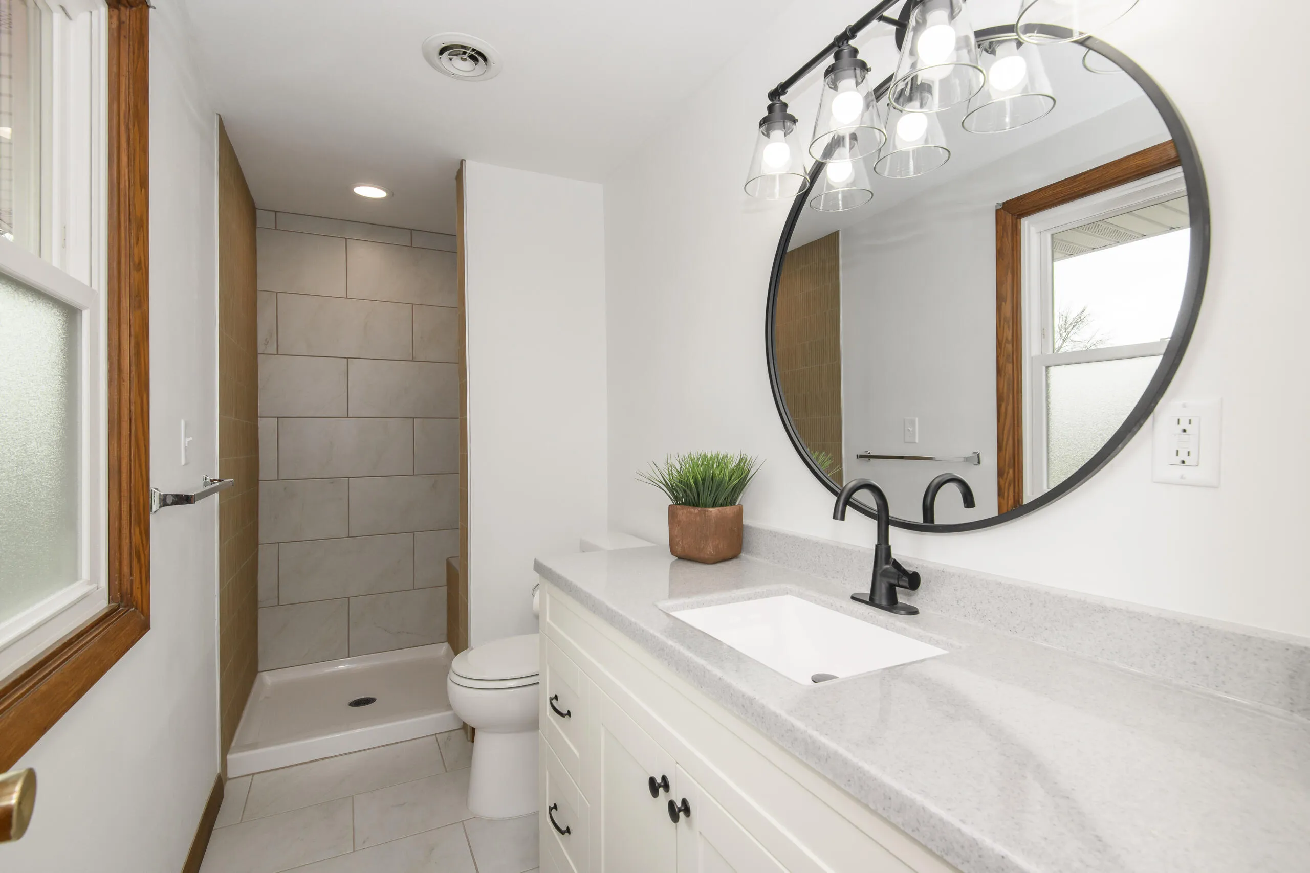 Gorgeous renovation. Enter the large foyer with tons of closet space. New white open concept kitchen with granite, new SS appliances, all new lighting, and huge island with storage. Brand new hardwood floors in much if the main level. Half bath with new vanity and fixtures. Freshly painted throughout. Family room with brick natural fireplace and patio door to new concrete patio. Primary bedroom with huge walk in closet, private bath with new vanity, fixtures, new CT shower with bench and decorative niche. Four large bedrooms all with new carpeting. Full hall bath with new CT flooring, new vanity, and all new fixtures. Newer energy efficient windows. French doors lead to a wonderful 3 season room. Lower with partially finished rec room area. and storage area.