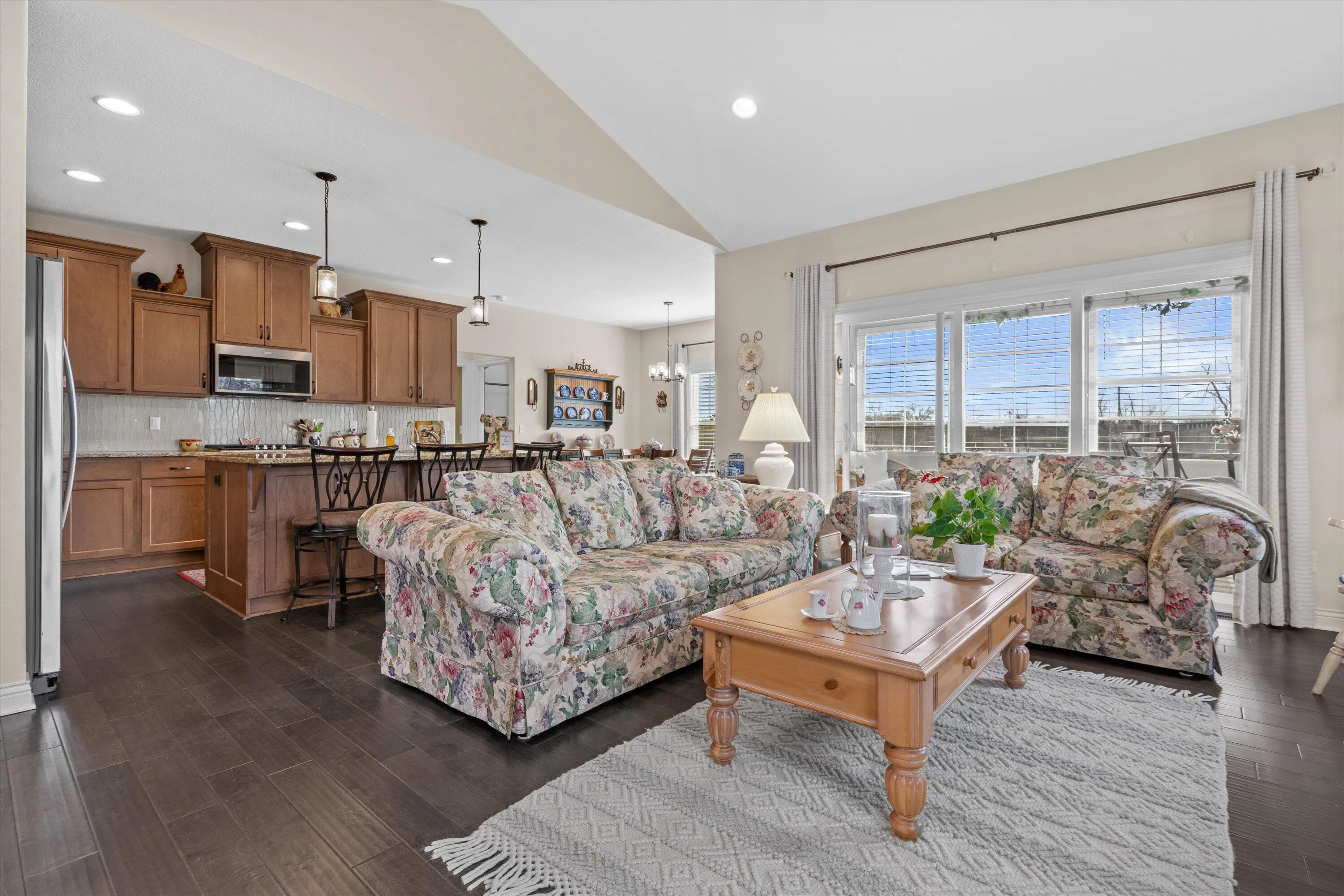 End Unit, 3 sides w/natural light. 3 Season Porch. This condo has a spectacular MBR with large walk-in closet and beautiful master bath with dual sinks and walk-in shower with ceramic tile. Open concept kitchen and dinette has a large island with granite countertops and pantry. Great room features a gas fireplace and cathedral ceiling. Abundant main floor storage space and a separate laundry room and mud room. A full basement with six windows offers tons of light and storage. Basement stubbed for a bathroom.