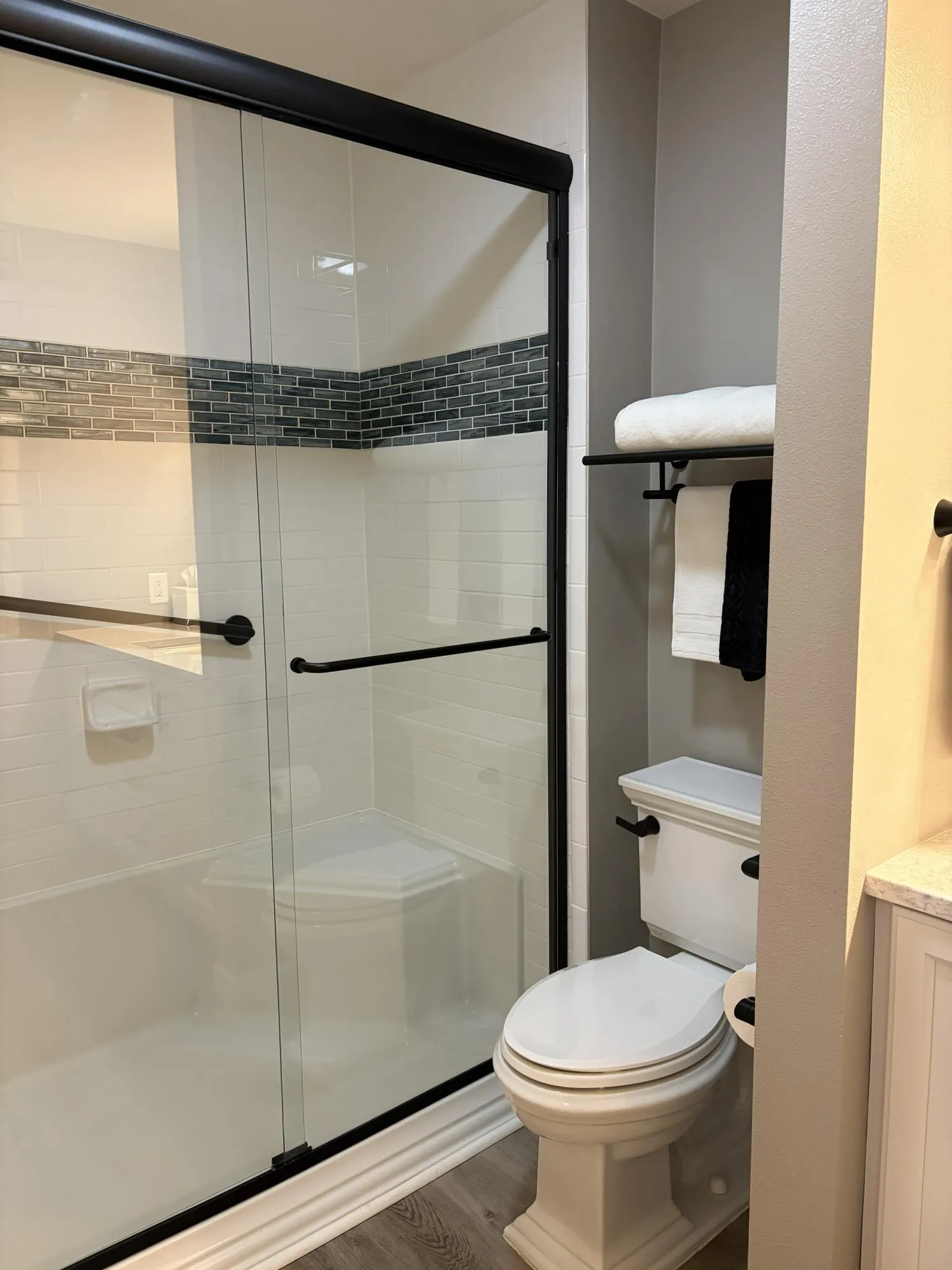 Welcome home to this beautifully renovated (2021) first-floor condo that blends modern style with everyday accessibility. Whether you’re looking for low-maintenance living, aging-in-place convenience, or simply a move-in-ready space with upscale finishes, this home delivers. The open-concept layout seamlessly flows between the living, dining, and kitchen areas while providing an abundance of natural light, luxury flooring, and neutral designer tones. The kitchen is a standout, boasting sleek black granite countertops, custom cabinetry with upgraded 15” deep upper cabinets, modern tile backsplash, and stainless-steel GE appliances. High-end finishes continue throughout both bathrooms with elegant tiles, and Kohler fixtures and faucets. The main bath features a custom vanity